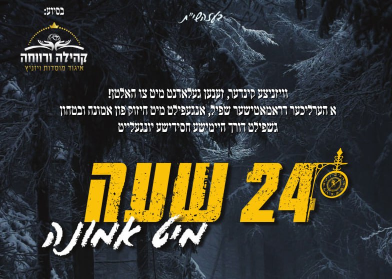 אין קרית ויזניץ בני ברק ווערן געמאכט די לעצטע הכנות שטייענדיג געציילטע טעג איידער עס וועט פארקומען די גרויסארטיגע שפיל "פיר און צוואנציג שעה מיט אמונה", א שפיל מלא תוכן ותענוג רוחני, אריינצובאקן אמונה און בטחון אין די יונגע הערצער, בברכתו ובעידידו פון מרן אדמו"ר מויזניץ שליט"א, ובהדרכתם פון די דיינים ומורי הוראה פון קהילות ויזניץ איבער גאנץ ארץ ישראל.