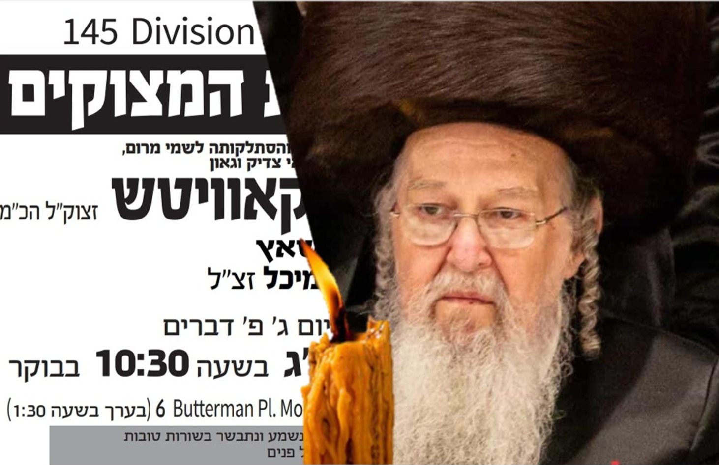 די מסע הלוי' פון כ"ק האדמו"ר משאץ וויליאמסבורג – הגה"צ רבי יוסף חיים מאסקאוויטש זצ"ל וועט ארויסגייט היינט 10:30 פארמיטאג פון בית מדרשו אויף Division Ave 145 אין וויליאמסבורג, אויפן וועג קיין מאנסי צום שאצער ביהמ"ד אויף Butterman אין פון דארט צום מאנסי'ער בית החיים ווי די רבי וועט קומען לקבורה סמוך ונראה צום ציון פונעם שווער כ"ק האד' מדעעש מיאמי זצ"ל.