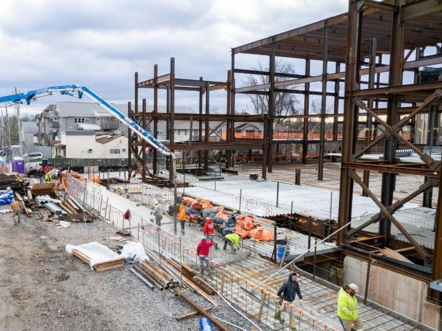 נעכטן דינסטאג איז אנגעקומען א גרויסער טראק לאוד מיט שטיינער לצורך הבני', און דעם פרייטאג וועלן די סקווערער גאסן ווירבלען מיט אזויפיל ווי 80 צעמענט טראקס וועלכע וועלן מאכן זייער וועג צו דעם נייעם ביהמ"ד צו גיסן דעם גאנצן שטאק פונעם היכל הביהמ"ד.