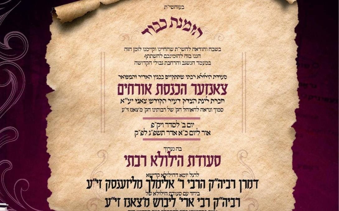 קול בחצרות – דעם קומענדיגן מאנטיג נאכט ליל כ"א אדר וועט אפרגעראכטן ווערן אין שטאט צאנז א יארצייט סעודה לרגל יומא דהילולא קדישא פונעם הייליגן רבי רבי אלימלך זי"ע אינאיינעם מיט די יארצייט פון הגה"ק רבי ארי' לייבוש מצאנז זי"ע וואס האט זיך אויסגעוועלט נסתלק ווערן אין דעם גרויסן טאג, אין שפיץ פון די אייניקלעך כ"ק האדמורי"ם שליט"א לבית צאנז.