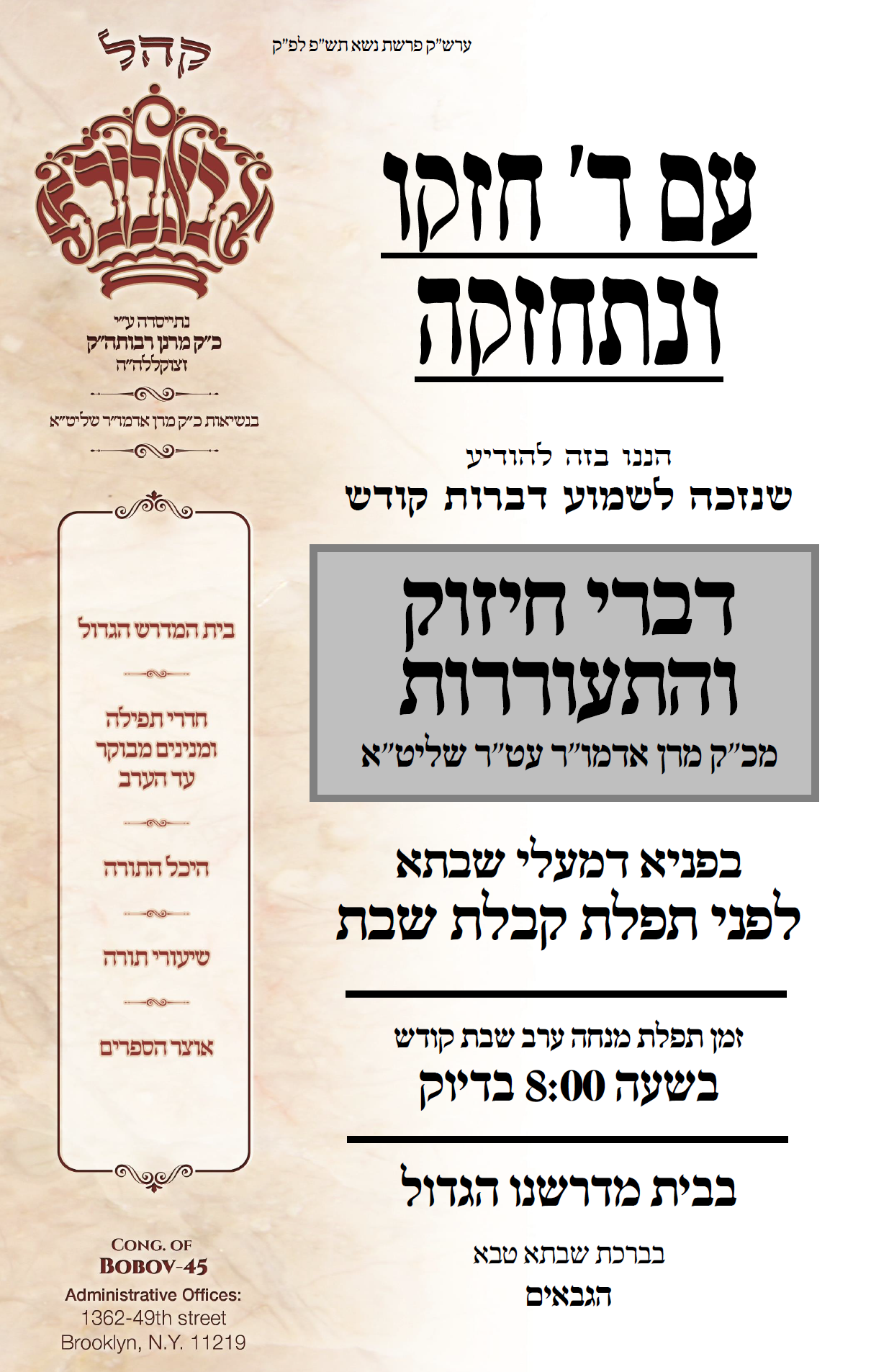 מטעם קהלת באבוב-45 איז פאררופן געווארן א וויכטיגע 'אסיפת התעוררות' אויף דעם פרייטאג צונאכט'ס ווען כ"ק אדמו"ר מבאבוב-45 שליט"א וועט אויפטרעטן מיט 'דברי התחזקות' זיך מחזק צו זיין אין די פילע ענינים וואס די חסידים זענען ליידער נתרשל געווארן אין די ימי המגיפה צוליב 'עת לעשות לה' און די מצוה פון 'ונשמרתם'. אויפן רוף פון די קהלה איז יעדע איינציגסטע חסיד אויפגעפאדערט אנטייל צו נעמען ביי די אסיפה אן אויסנאם. מ'וועט דאווענען מנחה ערב שבת אום אכט אזייגער און תיכף נאך מנחה וועט דער רבי אויפטרעטן מיט דברות קדשו.