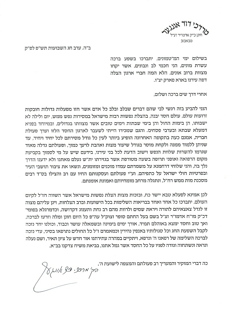 ערב יו"ט האט כ"ק אדמו"ר מבאבוב-45 שליט"א אפגעשריבן א ספעציעלע 'מכתב חיזוק' פאר די העלדישע וואלאנטירן פון 'חברה הצלה' וועלכע האבן געטריי באדינט און אפגעראטעוועט הונדערטע נפשות ישראל בעת צר, דורכאויס די ביטערע מגיפה.