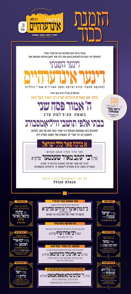 אלקא דמאיר ענני: היינט נאכט געפאלט די יארצייט פון התנא האלקי רבי מאיר בעל הנס, אין וויליאמסבורג וועט פארקומען א רייכע 'דינער אינדערהיים' אין די טויזענטע אידישע וויליאמסבורג'ע שטיבער, לטובת כולל שומרי החונות לצדקת רבי מאיר בעל הנס, ווי עס איז צוגעגרייט א גאר רייכע פראגראם, ווי עס וועלן אויפטרעטן אויפן טעלעפאון א רייע אדמורי,ם ורבנים שליט"א. צווישן אנדערע כ"ק אדמו"ר מוויען שליט"א, גאב"ד אנטווערפן שליט"א, הרה"צ ר' אלימלך בידערמאן שליט"א און נאך.