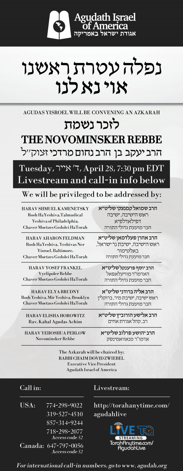היינט וועט אפגעהאלטן ווערן אויפן טעלעפאן אן 'עצרת הספד והתעוררות' להסתלקותו