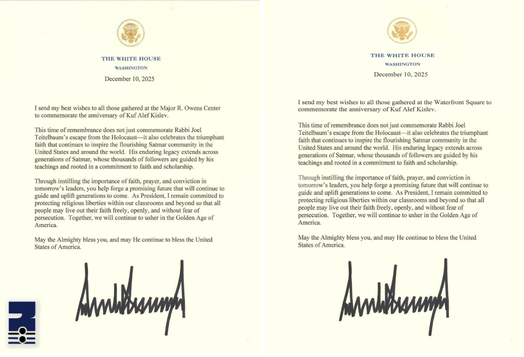 אין א היסטארישער שריט האט דער אמעריקאנער פרעזידענט דאנעלד טראמפ יר"ה אפגעשיקט צוויי בריוון אדרעסירט צו די רבבות סאטמארער חסידים וואס האבן זיך נעכטן צוזאמגענומען ביי די מעמדי הודעה לרגל כ"א כסלו דער יום ההצלה והשחרור פון הרה"ק מסאטמאר זי"ע ביים ביטערן צווייטן וועלט קריג.